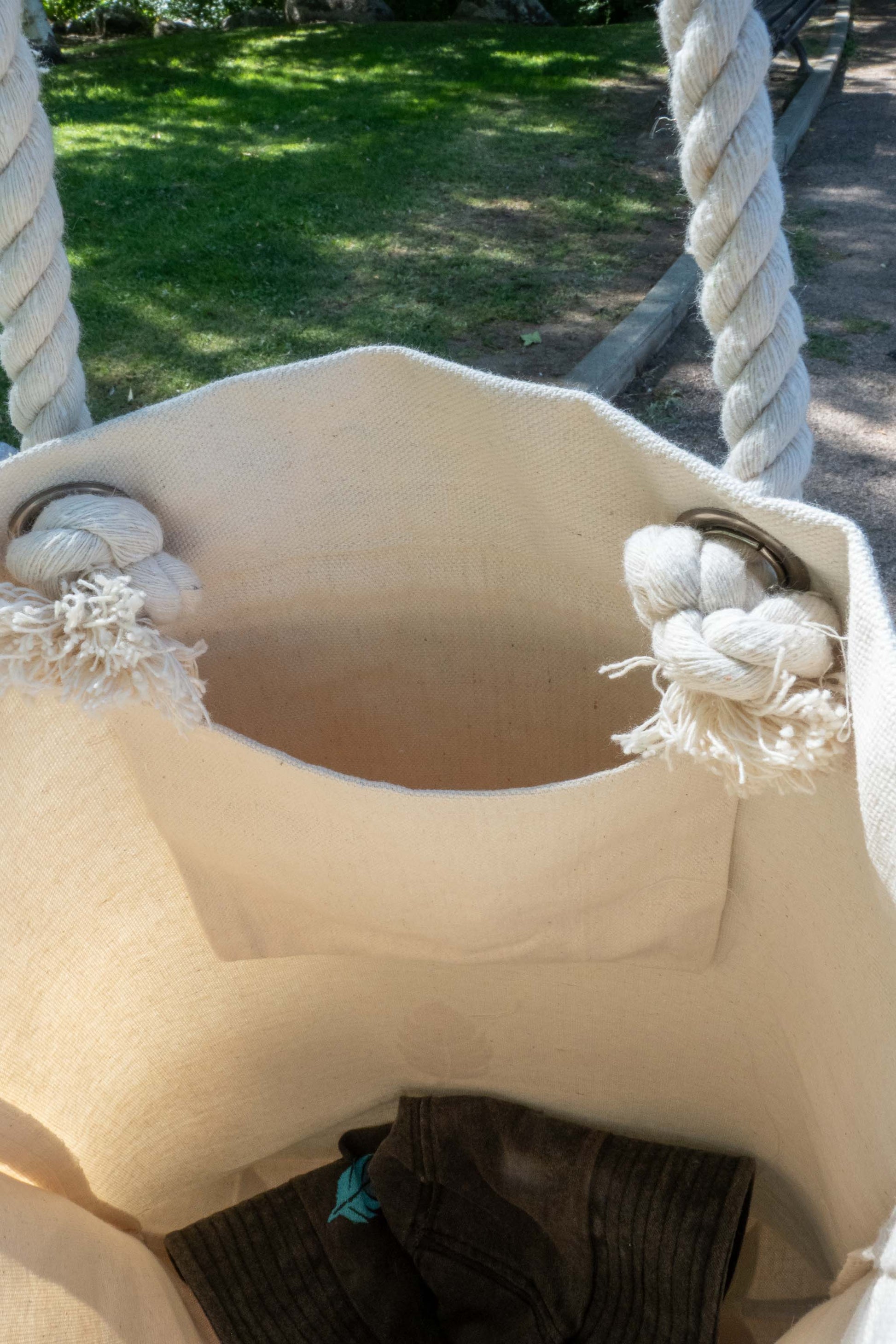 Cuenta con bolsillo interior y sus asas son cuerdas. Además es ancha: su base son 10cm.